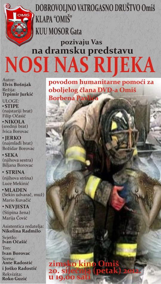 U petak, 20. siječnja 2012. godine, u zimskom kinu Omiš (ulaz do DVD-a) s poćetkom u 19 sati održat će se humanitarna akcija za prikupljanje novčanih sredstava, za člana našeg društva, NAŠEG BRATA, Borbena Pavlića koji je do jućer s nama na terenu spašavao ljudske živote, da bi jedan lječnički pregled naglavce okrenuo njegov život shvativši da boluje od leukemije. Budući da je lječenje ove bolesti dugotrajan proces te iziskuje puno materijalnih sredstava, koje sam ne može pokriti, odlučili smo na ovaj način u suradnji s KUU MOSOR Gata i KLAPOM "OMIŠ", a uz pomoć svih ljudi koji su u mogućnosti ponuditi bilo kakvu pomoć, odužiti mu se bar malo, te da vatrogasni slogan pretvorimo iz rijeći u djela: