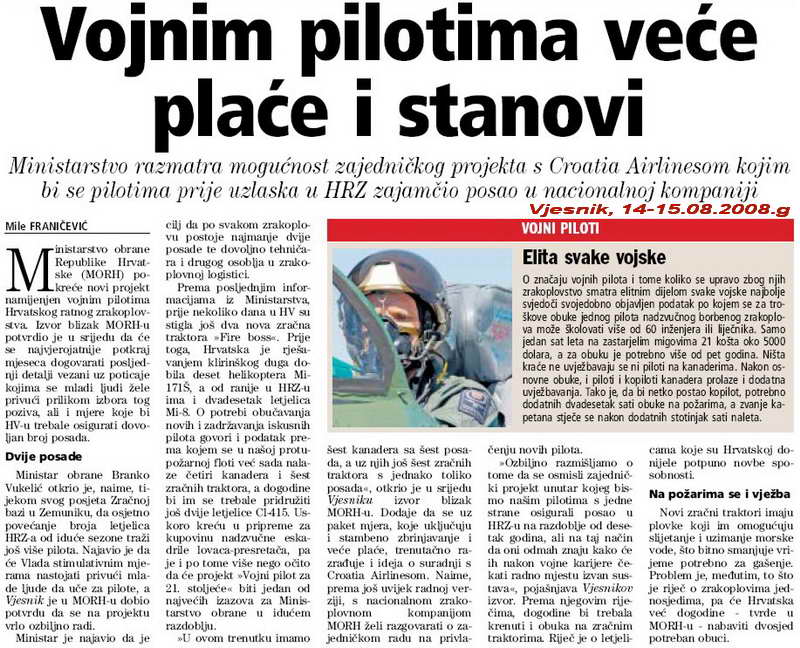 Upravljanje kanaderom vojni piloti smatraju svojevrsnim vrhuncem karijere, ali i iznimno napornim, gotovo iscrpljujućim poslom. Ilustracije radi, prošle godine, u jeku protupožarne sezone, hrvatski su kapetani kanadera znali u zrakoplovu iznad požarišta dnevno provesti i do 12 sati. Na požare bace i do 160 tona vode, što je kažu stručnjaci dvostruko više od svjetskog standarda.