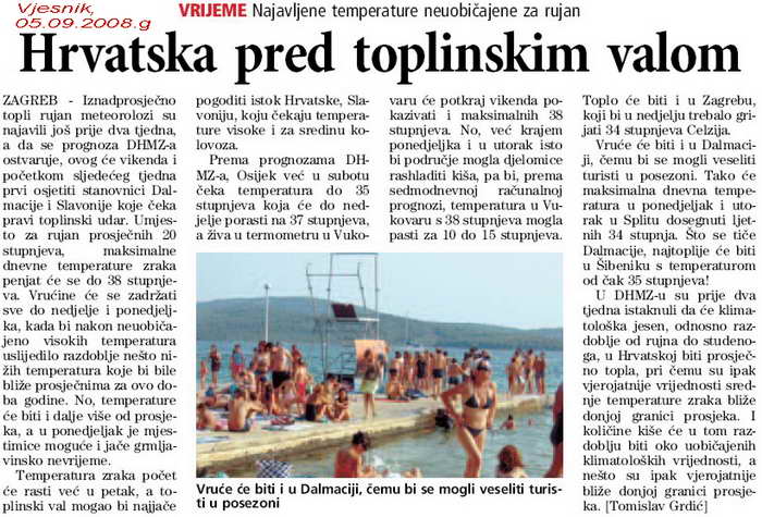 ZAGREB - Iznadprosječno topli rujan meteorolozi su najavili još prije dva tjedna,a da se prognoza DHMZ-a ostvaruje, ovog će vikenda i početkom sljedećeg tjedna prvi osjetiti stanovnici Dalmacije i Slavonije koje čeka pravi toplinski, maksimalne dnevne temperature zraka penjat će se do 38 stupnjeva.