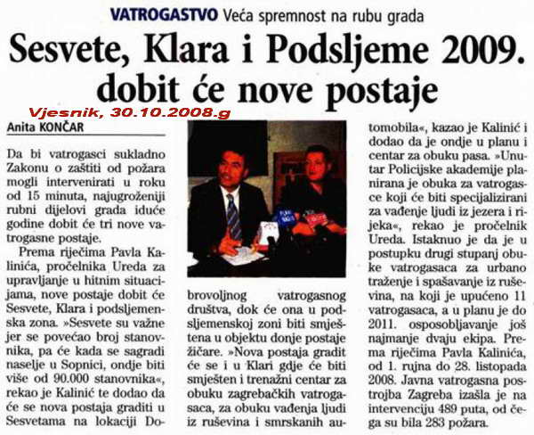 Do sljedeće godine Zagreb će dobiti tri nove vatrogasne postrojbe, najavio je jučer Pavle Kalinić, pročelnik Ureda za upravljanje u hitnim situacijama. Vatrogasne postrojbe bit će osnovane u Sesvetama, Svetoj Klari i Podsljemenu kako bi vatrogasci mogli intervenirati u roku 15 minuta.