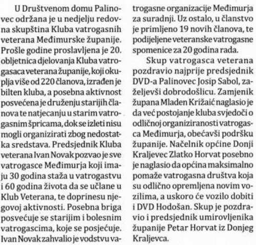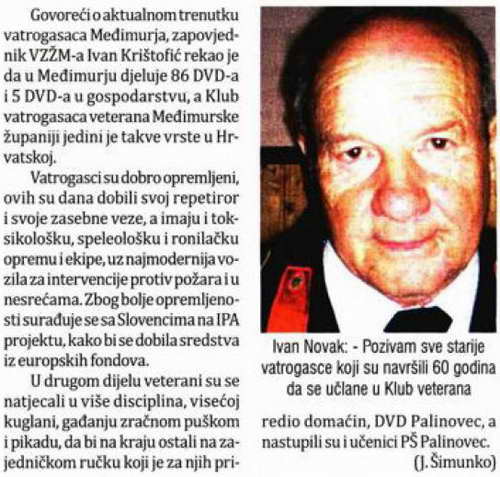 Predsjednik Kluba veterana Ivan Novak pozvao je sve vatrogasce Međimurja koji imaju 30 godina staža u vatrogastvu i 60 godina života da se učlane u Klub Veterana, te doprinesu njegovoj aktivnosti....