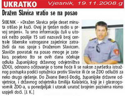 »Dražen Slavica prije deset minuta otišao je kući. Ovaj je tjedan radio u prvoj smjeni«. Tu smo informaciju čuli u utorak nešto poslije 15 sati nazvavši broj centrale šibenske vatrogasne zajednice zatraživši da nas spoje s Draženom Slavicom. Slavičin povratak na posao mnoge je zatekao, posebno što se ovih dana očekuje odluka Županijskog državnog odvjetništva (ŽDO), odnosno očitovanje o tome hoće li se nakon završetka istražnog postupka podići optužnica protiv Slavice ili će se ŽDO odlučiti za neko drugo rješenje. Do Živane Beroš-Dodig, županijske državne odvjetnice, i državnog odvjetnika Emilija Kalabrića, koji je i glasnogovornik ŽDO-a, u ponedjeljak i utorak unatoč brojnim pozivima nismo uspjeli doći