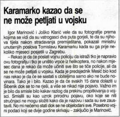 - Naša su djeca dva puta gorjela. I ovo vam je dokaz, pa neka svi iz države, prvenstveno vojske, napokon objave podatke koje imaju, a koje skoro dvije godine skrivaju. Ja sam ih prvi našao. Došao sam do njih oko 17,30 sati, a spasioci, odnosno GSS stigao je u 18,30. To nisu mjesta na kojima su bili, nije raspored osoba kako smo ih našli, niti isti stupanj izgorenosti koji smo zatekli. Našao sam ih potpuno spaljene, mrtve, nisu bili jedan do drugoga, pregazilo ih je dok su pokušavali pobjeći nakon što su već bili ozlijeđeni. Prisiljeni smo ovo dati u javnost u nadi da će napokon netko progovoriti jer je nama dosta čekanja i zataškavanja. Kada je došao GSS i počeo izvlačiti one koji su još uvijek bili živi oko 18,30 sati iz svog spasilačkog helikoptera su slikali stanje na zemlji, koje odgovara onome što sam i ja vidio, ali ne stanju sa prve slike. Ti ljudi su gorjeli dva puta. Na prvoj fotografiji nema niti jedne vlati trave. Od čega su opet mogli izgorjeti. Pa oni sjede, poskidali su odjeću sa sebe, čekaju pomoć. Helikopter koji je došao je natopio teren benzinom i to ih je ponovno spalilo, stvorilo je doslovno eksploziju koja ih je zgazila. Od helikoptera su bježali, a ne od trave. Helikopter ih je prvi ugledao nakon što ih je požar ozlijedio, a zašto to nitko do sada nije objavio. To se ne zna, kao niti za ovu fotografiju. Skriva se, a sada je valjda jasno zašto, govori Joško Klarić, otac poginulog Dina Klarića, i sam vatrogasac koji je prvi našao stradalu skupinu.