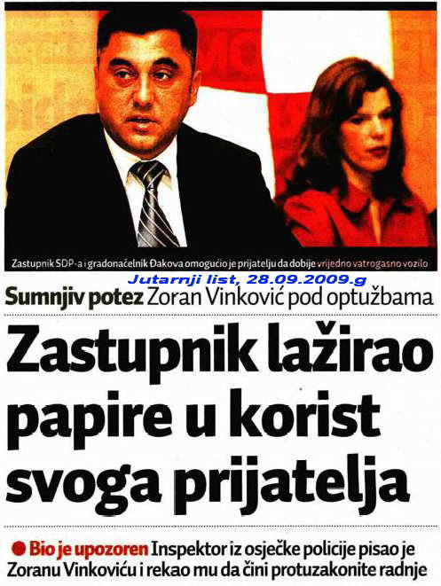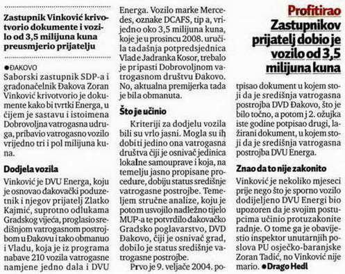 Saborski zastupnik i gradonačelnik Đakova Zoran Vinković krivotvorio je dokumente kako bi tvrtki Energa u čijem je sastavu i istoimena Dobrovoljna vatrogasna udruga, pribavio vatrogasno vozilo vrijedno tri i pol milijuna kuna...