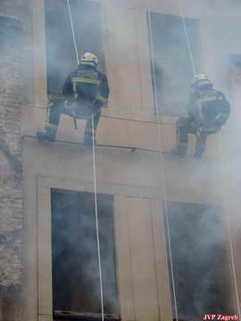 Vježbe su sadržavale spašavanje osobe sa vrha tornja pomoću autoljestve te sa prvog kata uskakanjem u zračni jastuk. Paralelno sa spašavanje se krenulo i sa gašenjem požara a kako se potom urušilo stubište tornja, vatrogasci su se samoizbavom spustili na tlo te su potom izbavom sa dva užeta spustili trećeg člana sa drugog kata tornja. I na kraju samospašavanje iz košare autoljestve, vatrogasac noseći Hrvatsku zastavu, spasio se spuštanjem po užetu što je bilo vrlo efektno sudeći prema uzdasima svih prisutnih