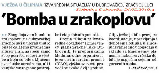 Zbog dojave o bombi u zrakoplovu na dubrovačkoj zračnoj luci "Čilipi" jučer ujutro oglašena je izvanredna situacija.