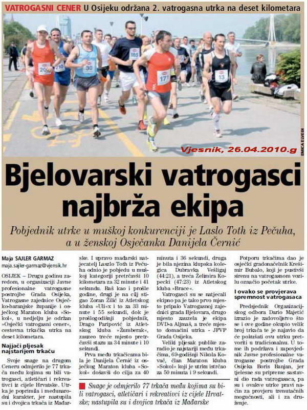 Vatrogasne zajednice Osječko-baranjske županije i osječkog Maraton kluba »Sokol«, u nedjelju je održan»Osječki vatrogasni cener«, cestovna trkačka utrka na deset kilometara.