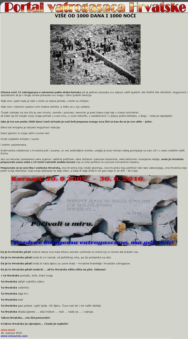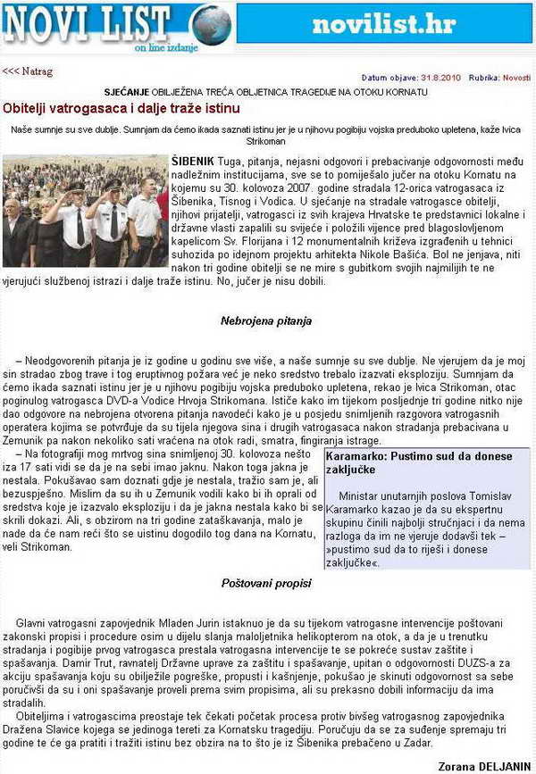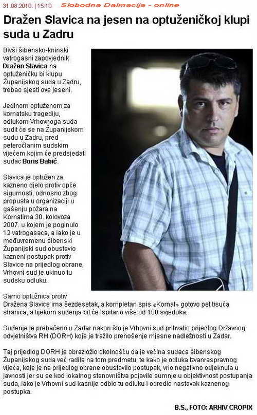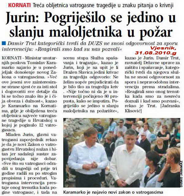 Kad ovo sve pročitam onda mi se povrača. Svi traže istinu a nitko je ne želi čuti jer takvu istinu kakvu bi ti koji je traže htjeli takve istine nema. Sigurno da niti jedan roditelj se ne može pomiriti sa smrću svog djeteta, to je razumljivo, ali nemogu tražiti onu istinu koja njima odgovar. U nijednoj sličnoj nesreći istraživanja nisu provodile osobe kojima su stradali rođaci nego nezavisni stručni i kvalificirani timovi stručnjaka koji mogu neopterećeno sagledati sve činjenice. I u ovom slučaju je sve tako napravljeno, ali rezultati ne odgovaraju pa se niti nemogu javno prezentirati i traži se neka nova istina koja ne postoji. Na žalost niti kroz proces D. Slavici neće se u potpunosti utvrditi svi propusti koji su imali posredni i neposredni utjecaj na ovu nesreću i neće odgovarati oni koji su te propuste napravili jer to će biti proces u kom će se dokazivati krivnja ili ne krivnja samo D. Slavice ali ne i ostalih. Optužnica koja je napisan tereti samo njega a ne i druge koji su propustili radnje. Da su ovi koji traže istinu htjeli išta čuti o njoj mogli su doći na seminr u Makarsku, ali tamo je poslan drugi i treći zapovjedni lanc a svi ostali odgovorni su ga bojkotirali. Zašto je tako, zašto se ne želi čuti istina i raspravljati o svim propustima koji su učinjeni u ovom slučaju, zašto niti jedna organizacija na razini države (HVZ, DUZS, MUP i sl.) ne želi raspravu o ovim propustima. Svi se skrivaju iz tog da se nebi prejudicirala sudska odluka što je glupost. Istraga je završena, optužnica je podignuta protiv samo jedne osobe a njih puno je prošlo neokrznjeno i čeka se apsolutna zastara za njih a D. Slavica je samo žrtveno janje koje nosi breme cijelog sustav i svih onih koji su u njemu napravili pogreške. Mogao bih o ovom još puno tog ali i to je lajanje na mjesečinu, nema te tko ćuti i s tobom ukrstiti argumente da se potvrdi ili obori teorija o izgaranju eksplozivne smjese i dođe do istine i da za propuste odgovaraju oni koji su ih napravili a ne onaj koji nema veze s tim propustima. Pozdrav