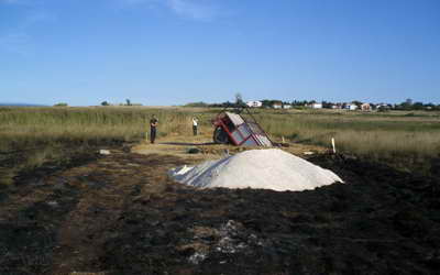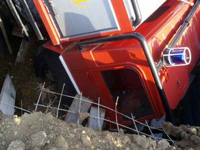 Nakon toga su ušli u vozilo i počeli se okretati. Kako je ispričao zapovjednik Županijske vatrogasne zajednice Željko Šoša, tada su prednjim dijelom vozila upali u praznu septičku jamu duboku 2,6 metara. Vatrogasci su se ozlijedili i Hitna ih je odvezla u bolnicu u Zadru. Vjerojatno su ozljede lakše.