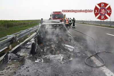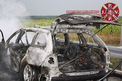 BMW njemačkih registarskih oznaka do kotača je izgorio je u četvrtak na autocesti između Osijeka i Đakova. Ozlijeđenih nije bilo, iako su se pored vozača u automobilu nalazile četiri osobe.