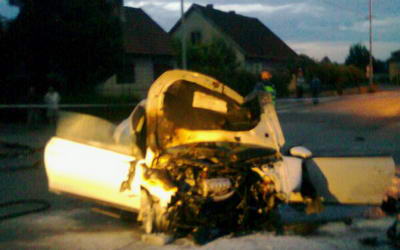 Dolaskom na mjesto intervencije za svega jednu minutu uviđaju požar automobila WV Sirocco, koji je prethodno teško oštečen u prometnoj nesreći.
