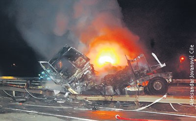 Samo pukom srećom niko nije stradao u stravičnom sudaru dva kamiona koji se sinoć oko 19 sati dogodio nadomak naplatne rampe „Vrčin". Vatrogasci se satima borili sa serijom eksplozija i vatrenom stihijom...