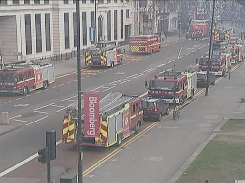 Stotinjak vatrogasaca se bori s požarom koji je u četvrtak ujutro izbio u blizini Cityja, dijela Londona u kojemu je smještena većina poslovnih zgrada. Požar je izbio oko 6,30 h, a jedan očevidac je za BBC izjavio da je prije požara čuo eksploziju. Još uvijek se ne zna ima li ozlijeđenih. Vatra je zahvatila polovicu krova, a jedan od vatrogasaca kaže i da je u plamenu velik dio unutrašnjosti zgrade.