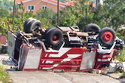 Hitajući na veliki požar u omiškom zaleđu na cesti Srinjine-Tugare oko 12:40 došlo je do prevrtanja opremljene vatrogasne cisterne TAM190 DVD "Mladost" iz Kaštel Sućurca, U vozilu su se nalazila četvorica vatrogasaca koja su odmah prebačena u splitki KBC "Firule"