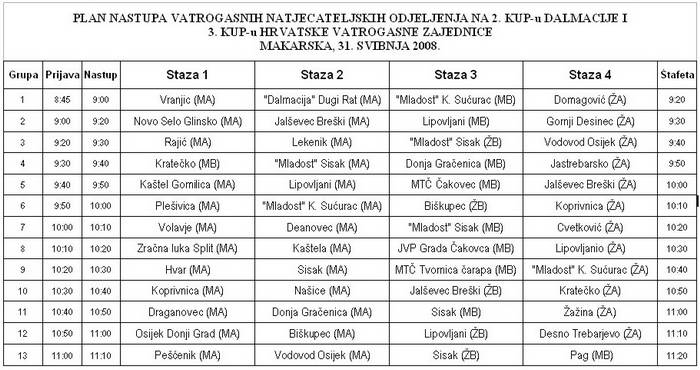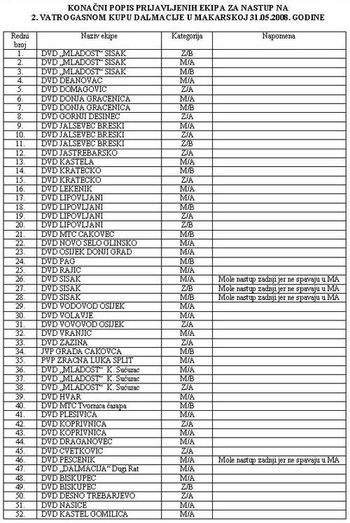 Za 2. KUP DALMACIJE, a ujedno i 1. kolo KUP-a HVZ-a 2008., što je planiran za 31. svibnja u Makarskoj do predviđenog roka pristigle su slijedeće prijave!