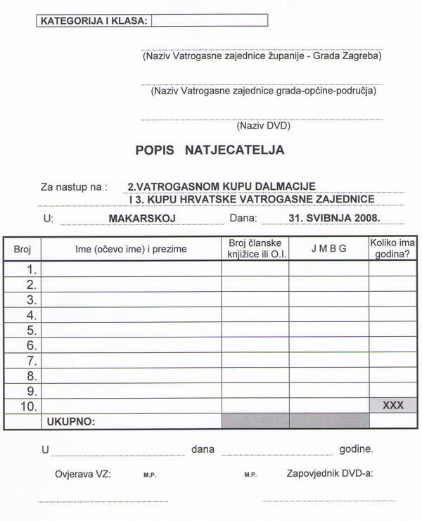 POPUNJEN I OVJEREN POPIS NATJECATELJA DONIJETI U MAKARSKU I PREDATI PRIJEMNOM ODBORU „A“ PRILIKOM PRIJAVE ZA NASTUP.