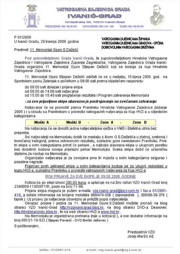 U nedjelju 15.lipnja na sportskom parku Zelenjak u Ivanić-Gradu održati će se 11 Memorijal Gjuro Stjepan Deželić. Memorijal se boduje za KUP HVZ-a. Memorijal se održava pod pokroviteljstvom Grada Ivanić-Grada u organizaciji Vatrogasne zajednice Grada Ivanić-Grada.