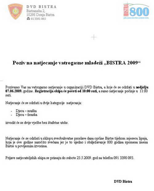 Poziv na natjecanje vatrogasne mladeži „BISTRA 2009“