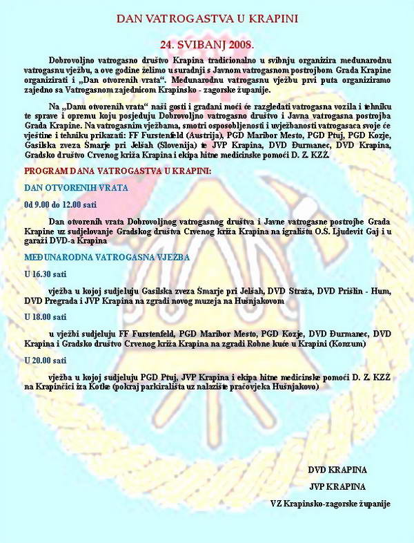 DAN VATROGASTVA U KRAPINI Dobrovoljno vatrogasno društvo Krapina tradicionalno u svibnju organizira međunarodnu vatrogasnu vježbu, a ove godine želimo u suradnji s Javnom vatrogasnom postrojbom Grada Krapine organizirati i „Dan otvorenih vrata“. Međunarodnu vatrogasnu vježbu prvi puta organizira zajedno sa Vatrogasnom zajednicom Krapinsko - zagorske županije.
