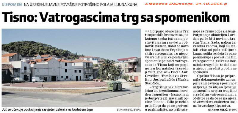 Potpuno obnovljeni Trg tišnjanskih bratovština, na kojemu treba još samo postaviti javnu rasvjetu i obnoviti nasade, dobit će novo ime i zvat će se Trg tišnjanskih vatrogasaca, a u njegovu središtu bit će postavljen spomenik petorici vatrogasaca iz Tisna koji su poginuli u kornatskoj tragediji 2007. godine - Ivici i Anti Crvelinu, Tomislavu Crvelinu, Josipu Lučiću i Marku Stančiću.....