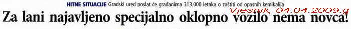 Na upit novinara, je li raspisan natječaj za nabavku specijalnog oklopnog vozila koje je Ured za upravljanje u kriznim situacijama lani najavio nabaviti za potrebe kriznih stanja, pročelnik Pavle Kalinić odgovorio je u petak, na predstavljanju novoga letka o opasnim kemikalijama, da će se s tim projektom pričekati, jer trenutačno - nema dovoljno novca.