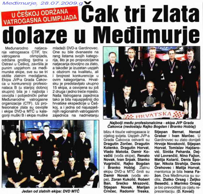 |  Međunarodno natjecanje vatrogasaca CTIF, tzv. vatrogasna olimpijada, održana prošlog tjedna u Ostravi u Češkoj, završila je punim uspjehom za međimurske ekipe, sve su se tri okitile zlatnim medaljama. Ekipa JVP-a Grada Čakovca u konkurenciji profesionalaca B (u starijoj dobnoj skupini) bila je i najbolja i osvojila i pobjednički pehar Međunarodne vatrogasne organizacije (CTF). Uz profesionalce zlata su osvojile i ekipe DVD-a MTČ u kategoriji muški B i ekipa muške mladeži DVD-a Gardinovec.