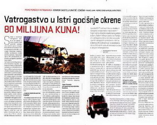 Video nadzor vrijedan 2 milijuna kuna trebao je zamijeniti ljude na osmatraćnicama, ali je uslijedio zahtjev za 20 postotnim povečanjem angažiranih ljudi! Rovinjskim je vatrogascima na raspolaganju gumeni ćamac za intervencije na moru s opremom od par stotina ti suća eura, iako brodovi i jahte imaju sustav za samogašenje. Buzetski vatrogasci teže dobavi helikoptera, štoje krajnje neracionalno obzirom na troškove posade i održavanja... Tu treba napomenuti da 90 posto opreme za istarsko va trogastvo.ali i izradu protupožarnih planova i slićne strućne dokumentacije obavlja jedna tvrtka -