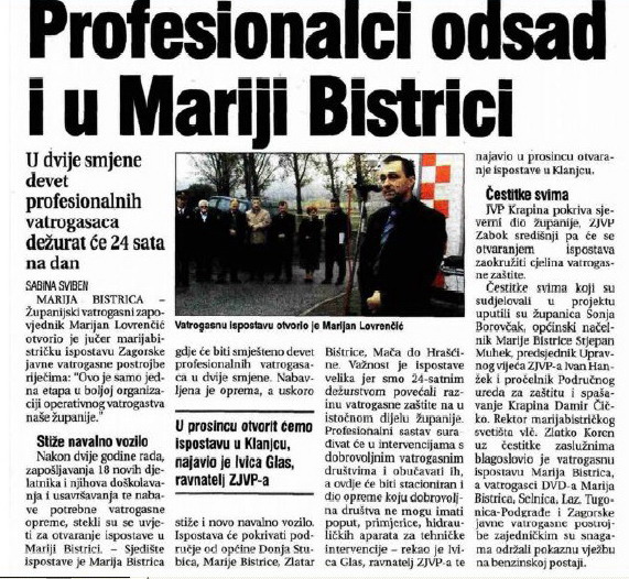 MARIJA BISTRICA - Županijski vatrogasni zapovjednik Marijan Lovrenčić otvorio je jučer marijabistričku ispostavu Zagorske javne vatrogasne postrojbe riječima: "Ovo je samo jedna etapa u boljoj organizaciji operativnog vatrogastva naše županije." Nakon dvije godine rada, zapošljavanja 18 novih djelatnika i njihova doškolavanja i usavršavanja te nabave potrebne vatrogasne opreme, stekli su se uvjeti za otvaranje ispostave u Mariji Bistrici.