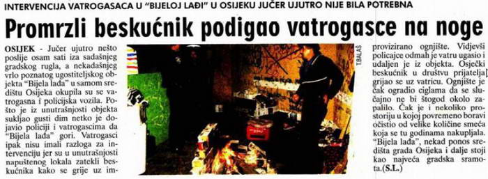 OSIJEK - Jučer ujutro nešto poslije osam sati iza sadašnjeg gradskog rugla, a nekadašnjeg vrlo poznatog ugostiteljskog objekta "Bijela lađa" u samom središtu Osijeka okupila su se vatrogasna i policijska vozila. Pošto je iz unutrašnjosti objekta sukljao gusti dim netko je dojavio policiji i vatrogascima da "Bijela lađa" gori. Vatrogasci ipak nisu imali razloga za intervenciju jer su u unutrašnjosti napuštenog lokala zatekli beskućnika kako se grije uz improvizirano ognjište. Vidjevši policajce odmah je vatru ugasio i udaljen je iz objekta. Osječki beskućnik u društvu prijatelja grijao se uz vatricu. Ognjište je čak ogradio ciglama da se slučajno ne bi štogod okolo zapalilo. Čak je i nekoliko prostoriju u kojoj povremeno boravi očistio od velike količine smeća koja se tu godinama nakupljala. "Bijela lađa", nekad ponos središta grada Osijeka i dalje stoji kao najveća gradska sramota.
