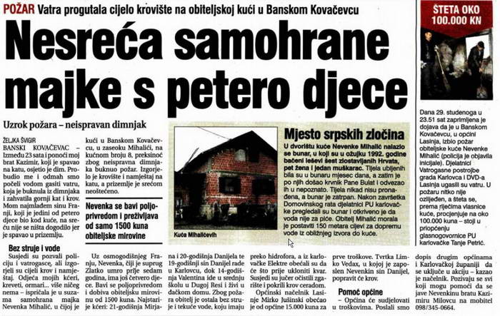 Susjedi su pozvali policiju i vatrogasce., ali izgorjeli su cijeli krov i namještaj. Odjeća mojih kćeri, kreveti, ormari... više ničeg nema - ispričala je u suzama samohrana majka Nevenka Mihalić, u čijoj je kući u Banskom Kovačevcu, u zaseoku Mihalići, na kućnom broju 8, preksinoć zbog neispravna dimnjaka buknuo požar. Izgorjelo je krovište i namještaj na katu, a prizemlje je srećom neoštećeno.
