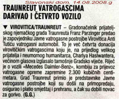 JVP Vtica je od DVD grada Traunreuta dobla 2 vozila, od ta dva vozila ne koristi se ni jedno jer se vozila samo uzimaju, a tek kad dođu traži im se namjena. Da nema DVD Vtice koji su prvi inicirali i uspostavili kontakt, svega ovog ne bi ni bilo. Vatrogasci oba DVD-a su povezali ova dva grada, a sad se to ni ne spominje. Svaka čast g. Charlyu, ali gradonačelnik i zapovjednik JVP bi se trebali sramiti.