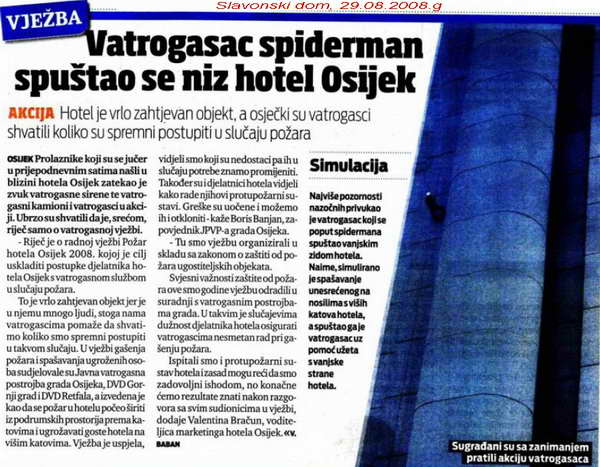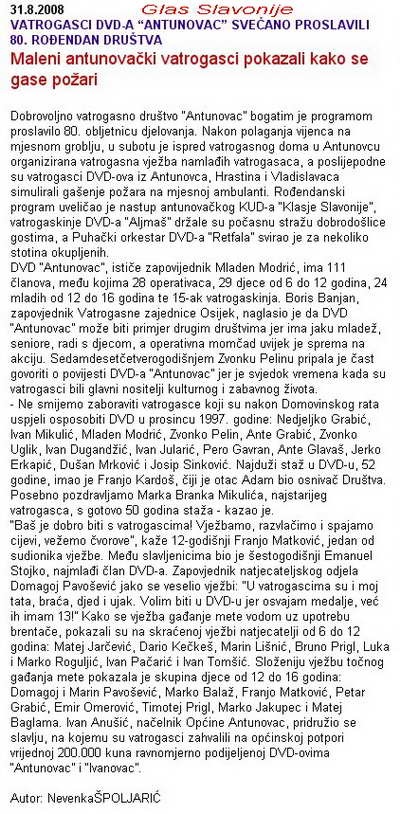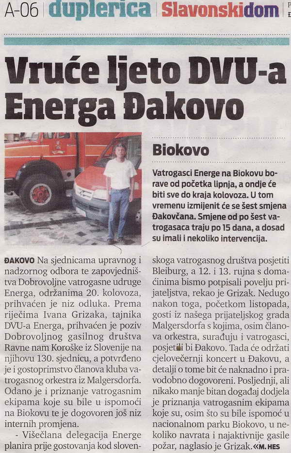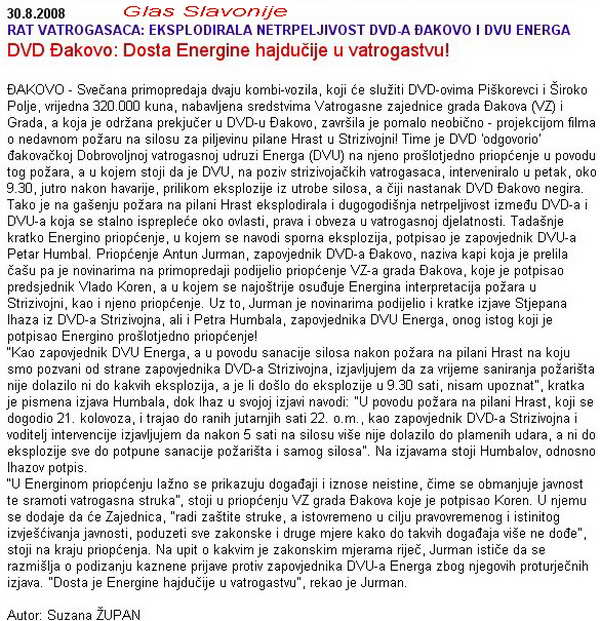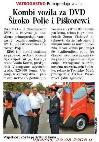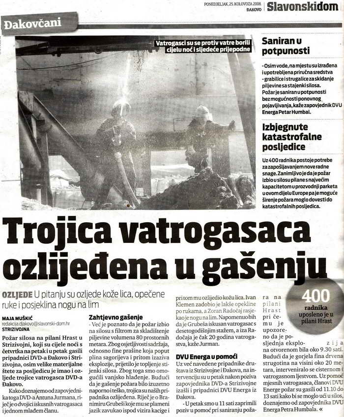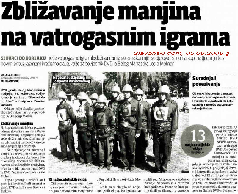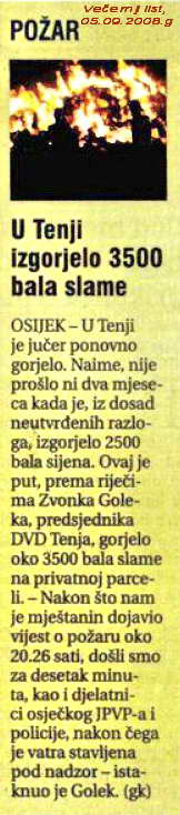 Vatrogasna natjecanja i jesu za zbližavanje manjina TENJA: Izgorjelo 3500 bala sijena 100 godina limene glazbe DVD Petrijevci Vatrogasni kombi za DVD Piškorevci i DVD Široko Polje DVD ĐAKOVO: Dosta Energine hajdučije u vatrogastvu DVD Antunovac proslavio 80 godina rada Trojica vatrogasaca ozlijrđrna pri gašenju Vježba gašenja i spašavanja na osiječkom neboderu