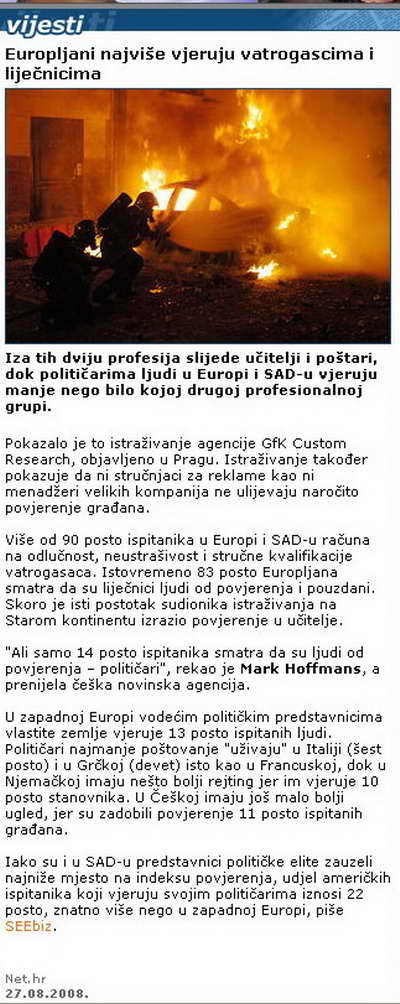 Europljani najviše vjeruju vatrogascima i lječnicima