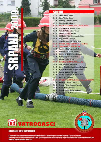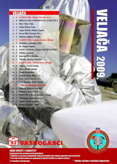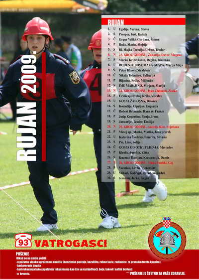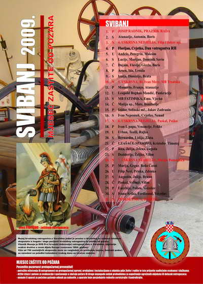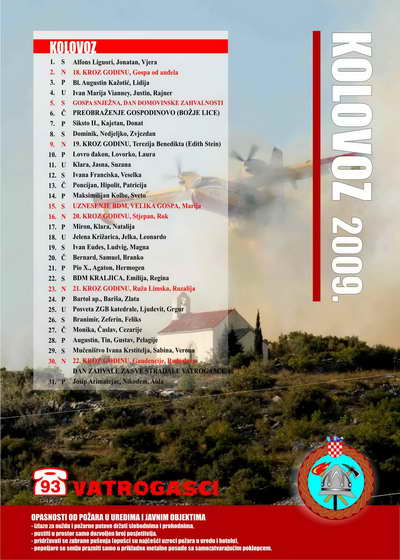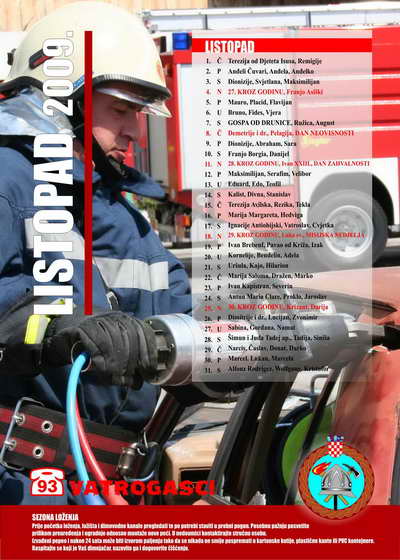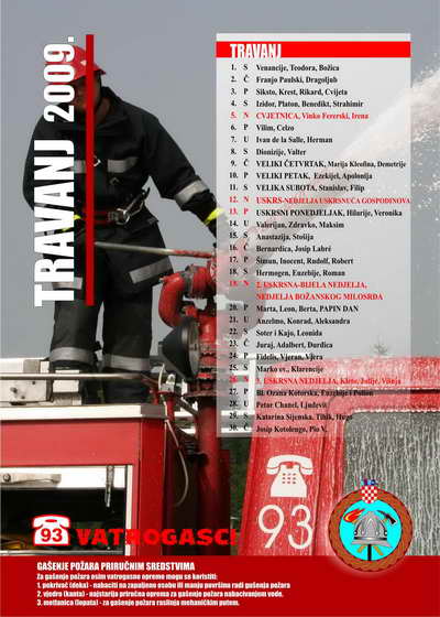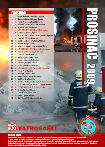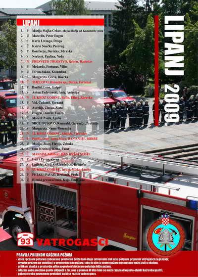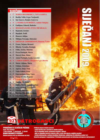 - na zasebnoj stranici za svaki mjesec nalaze se: pregledan kalendar, atraktivna fotografija vatrogasnih aktivnosti (natjecanja, vježbe, intervencije, suvremena oprema i sl.), preventivne poruke karakterične za pojedini mjesec te važniji brojevi telefona.