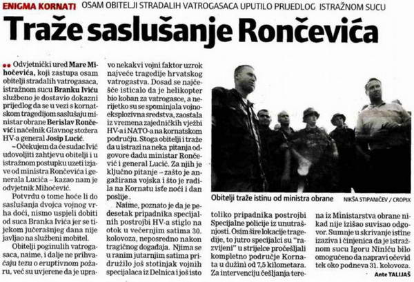 Odvjetnički ured Mare Mihočevića, koji zastupa osam obitelji stradalih vatrogasaca, istražnom sucu Branku Iviću službeno je dostavio dokazni prijedlog da se u vezi s kornatskom tragedijom saslušaju ministar obrane Berislav Rončević i načelnik Glavnog stožera HV-a general Josip Lučić.