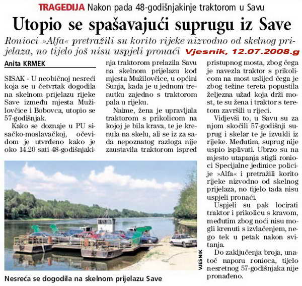 Suprug je prvim traktorom marke „Zetor“ navezao traktor na skelu s lijeve strane, dok je supruga vozila drugi traktor za njim marke „Ferguson“. Supruga je navezla traktor na skelu i zbog nepoznatih razloga nije stala već je produžila ravno u rijeku. Traktor je za sobom povukao prikolicu i na nju zavezanu kravu. Suprug je odmah skočio u rijeku i uspio izvući nesretnu suprugu ali na žalost on se nije uspio izvući i nesretnog 57-godišnjeg F.I. rijeka Sava, koja je upravo na tom mjestu duboka oko 6 m i dosta brza, povukla za sobom. Svjedoci sumnjaju da nesretnom F.I. vjerojatno zatajilo srce i da se nije uspio izvući na obalu.
