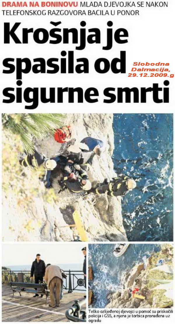 Mlađa ženska osoba, danas oko 14 sati, pokušala je izvršiti samoubojstvo skokom sa Boninova i to na predjelu pored dubrovačkog kina Slavica. Kako doznajemo u Policijskoj Upravi Dubrovačko-neretvanskoj, Centar 112 dobio je dojavu nakon čega su hitno na teren izašli policija, vatrogasci i gorska služba spašavanja.