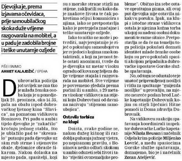 Dubrovacka policija jos uvijek ne zna tko je mladja zenska osoba koja je u ponedjeljak 28. prosinca oko 14,35 sati pala na obalu ispod dubrovackog ljetnog kina "Slavica" na poznatom vidikovcu Boninovo.